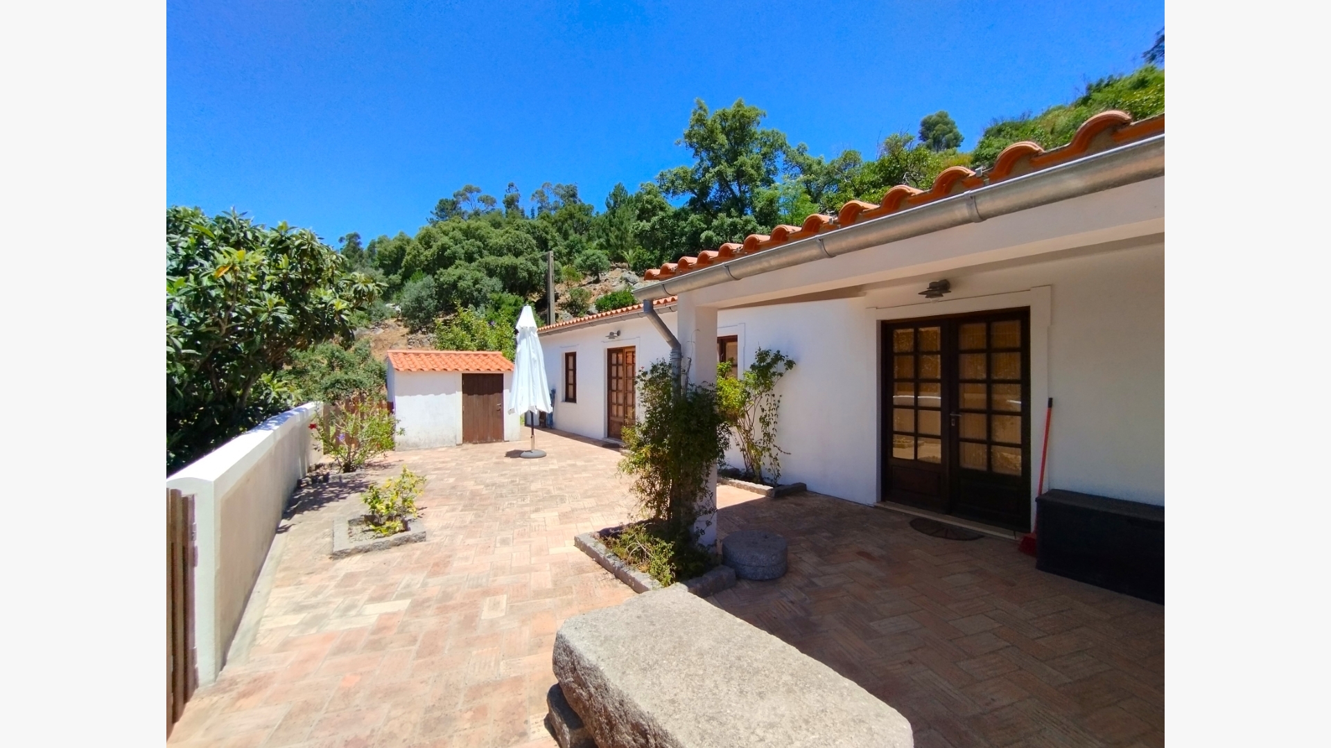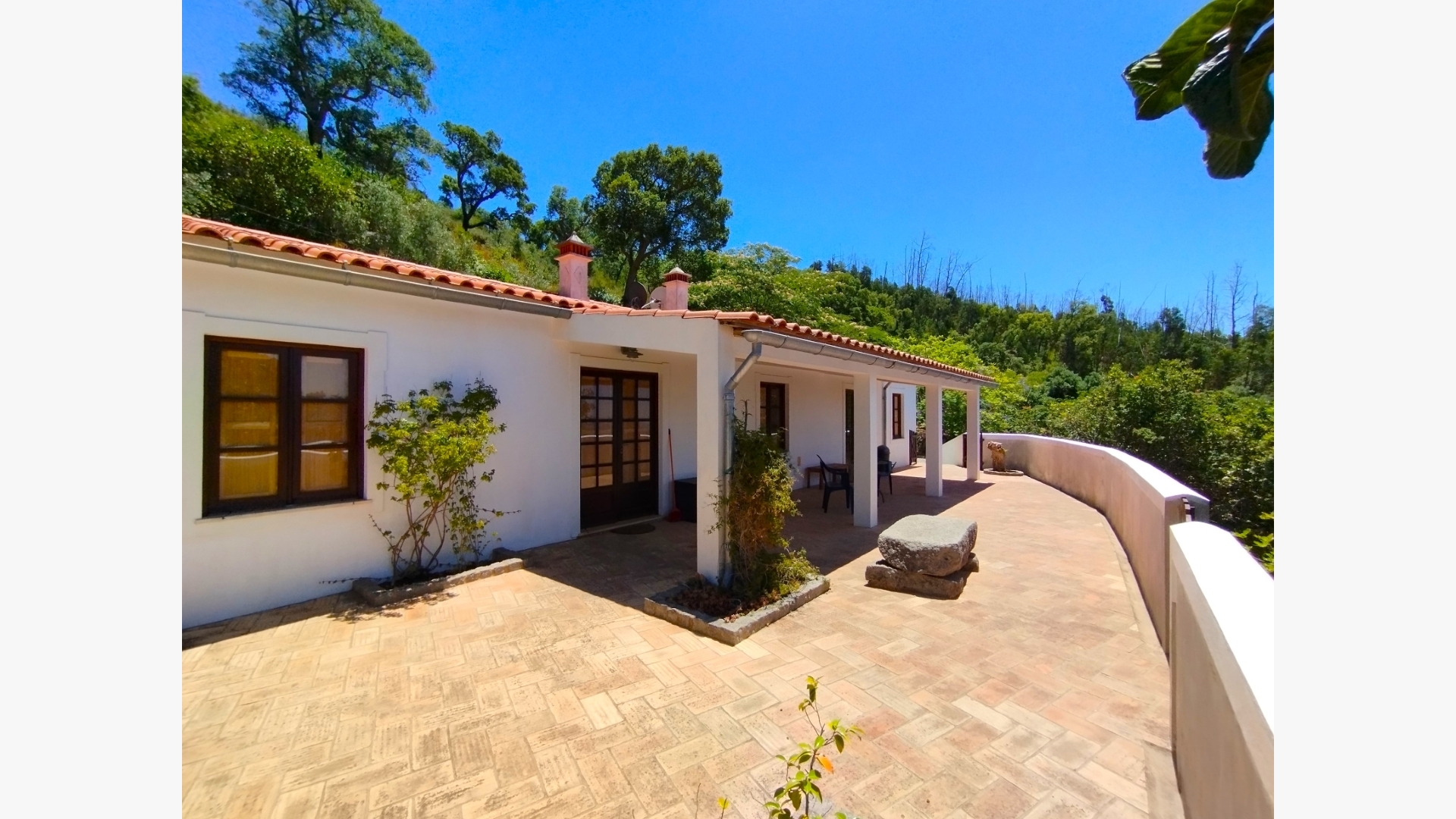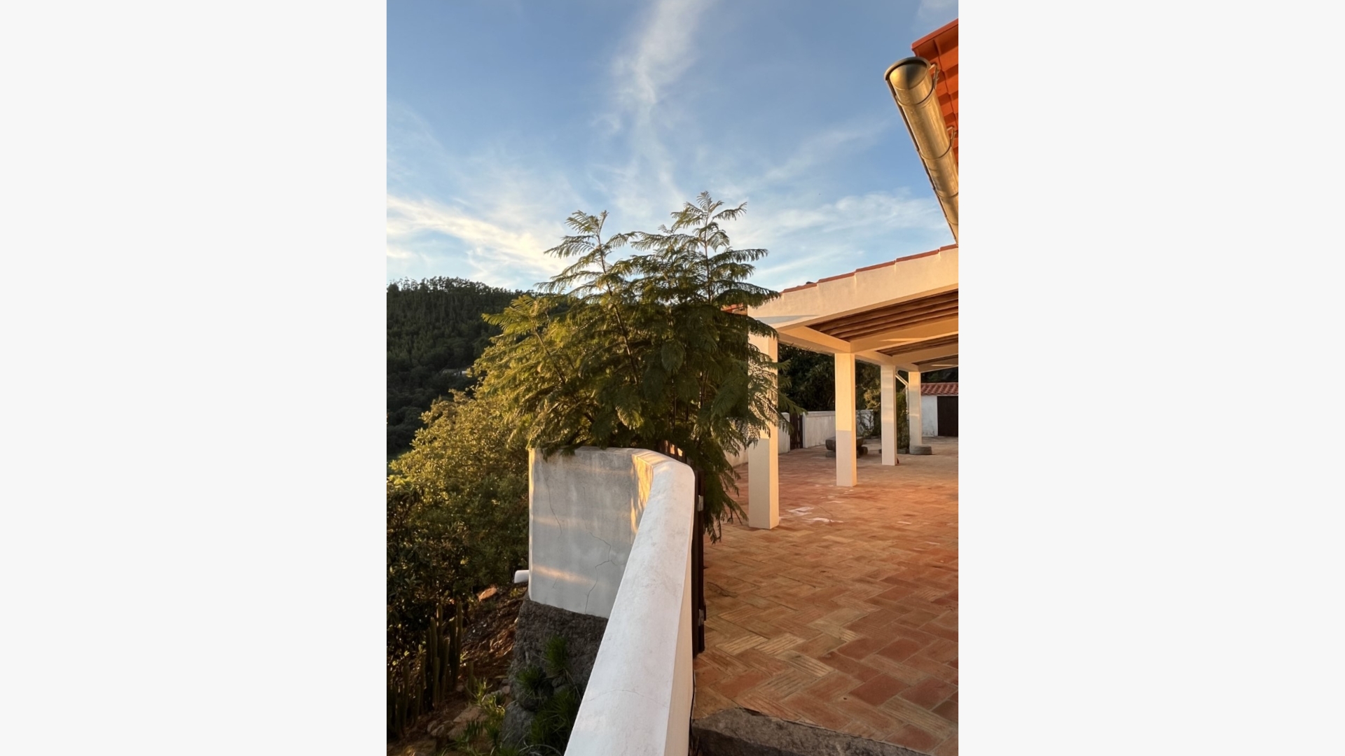 The living room has plenty of windows to let in the natural light and has large doors opening up to the front terrace. It’s heated by a large wood burner for the cooler winter months. The connected kitchen comes fully equipped with a gas stove, oven and the usual amenities. The hallway connects the 3 bedrooms and 2 en-suite bathrooms, all with views and access to the terrace. The large, covered terrace at the front of the house offers superb views of the south coast and the green hills of Palmeiras. It’s a great place to enjoy the peace and quiet and view the local nature. Enclosing this with glass would create an amazing garden room to add to the already ample living space.